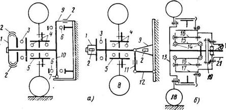 Для того чтобы чувствительные элементы реагировали на составляющие сил только в заданном направлении, применены подшипниковые узлы 3, 4, 5, 6 и 7. На схеме рис. 9, б чувствительные элементы шпильки 16 соединяют внутренний 15 и внешний 17 стаканы, стакан 17 жестко прикреплен к балке моста 21, во внутреннем стакане установлены подшипники 14 ступицы 13. Вал ступицы через муфту 19 соединен с полуосью 20. Схема расположения и включения тензорезисторов обеспечивает измерение пяти сил и моментов, действующих на колесо 18.