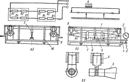Для прямой калибровки применяют балки с консольным или с симметричным нагружением двумя силами, действующими в середине пролета. Консольная балка по форме должна быть близка к балке равного сопротивления изгибу, поэтому при использовании консольной балки значительно снижается погрешность измерения, связанная с неточной установкой тензорезистора.