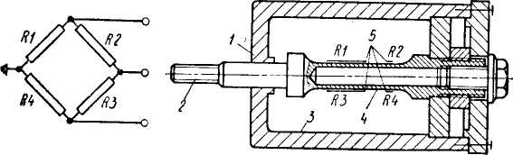 1 - направляющая; 2 - измерительный элемент; 3 - корпус; 4 - чувствительный элемент; 5 - тензорезисторы; R1, RЗ - активные тензорезисторы; R2, R4 компенсационные тензорезисторы