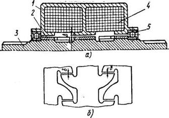Преобразователи линейных перемещений виброаппаратуры ВИ6-5МА основаны на принципе изменения индуктивности. Они позволяют измерять перемещения до 8-12 мм (ДП-2) и до мм (ДП-3) в диапазоне частот 0-120 Гц. Конструктивно преобразовательное устройство выполнено в виде цилиндра (рисунок 47, б) с резьбой для крепления. В отверстие, расположенное по оси цилиндра, входит подвижный сердечник 8, представляющий собой стержень, одна часть которого выполнена из стали, а другая из латуни. Внутри цилиндрического корпуса вокруг отверстия уложены обмотки 9: питающая и две измерительные.