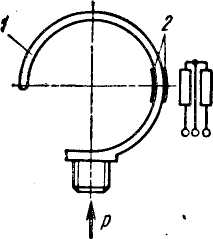 Нагрузка, действующая на кольцо, зависит от измеряемого перемещения и жесткости пружины. Напряжения в кольце от действия этой нагрузки измеряют с помощью тензорезисторов.