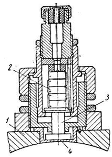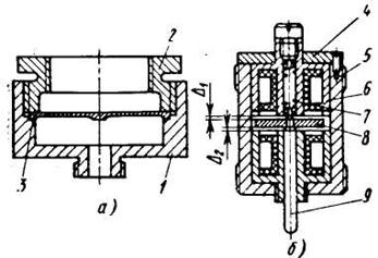 Чувствительный элемент (рисунок 42, а) состоит из корпуса 1, зажимной головки 2 и мембраны 3. Корпус резьбовым наконечником ввертывают в магистраль. Мембрану выбирают с таким расчетом, чтобы обеспечить линейную характеристику ее работы во всем диапазоне измеряемых давлений. Мембрана зажимной гайкой закреплена в корпусе. Разборная конструкция чувствительного элемента позволяет устанавливать мембраны разной толщины, тем самым расширяя диапазон измеряемых давлений.