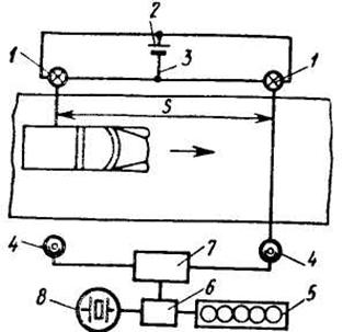 Импульс, который возникает в фотоэлементе при пересечении луча света, подается на хронограф, измеряющий время движения автомобиля на участке. Он включает в себя триггер 7, управляющий работой блока 6 импульсных счетчиков 5, которые подсчитывают число периодов колебаний кварцевого генератора 8.
