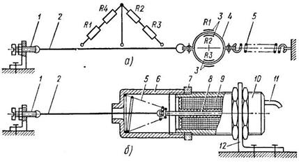 а - кольцевого типа; б - индуктивный ДП-21; 1 - натяжное устройство; 2 – струна; 3 - тензорезистор; 4 - кольцо; 5 - пружина; 6 - накидная гайка; 7 - контргайка; 8 - подвижный сердечник; 9 - обмотки; 10 - корпус; 11 - кабель; 12 – кронштейн
