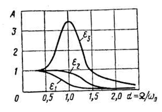 А - коэффициент пропорциональности, зависящий от отношения частот d и степени демпфирования ε.