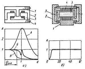 Они закреплены на пластинчатых пружинах 2. На сердечнике 3 размещены измерительные 4, а также питающая обмотки. При смещении пластин под действием сил инерции изменяется индуктивность обмоток. Это изменение фиксируется аппаратурой. Преобразователь не имеет жидкостного демпфирования, его характеристику (кривая А, рисунок 50, а) корректируют с помощью фильтра (кривая Б, рисунок 50, а).