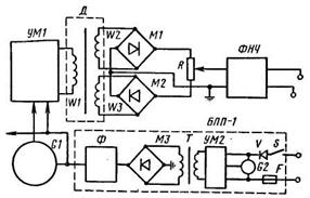 В блоке питания БПП-1 низкое напряжение постоянного тока (24-27 В) преобразуется в напряжение, необходимое для работы ламп усилительного блока с помощью транзисторного генератора G2, который вырабатывает ток с частотой 800 Гц. Напряжение от этого генератора подается на усилитель мощности УМ2, собранный на двух полупроводниковых триодах, и затем на повышающий трансформатор Т, выпрямитель МЗ и сглаживающий фильтр Ф. Таким образом получают высокое напряжение постоянного тока. Для защиты от нарушения полярности питания применен диод V, а от перегрузки - плавкий предохранитель F. Питание включают тумблером S.