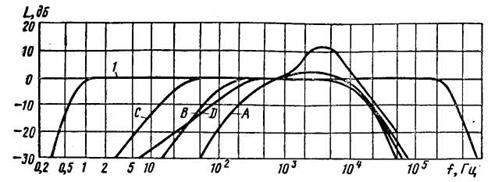 Уровень шума определяют по шкале шумомера. При измерениях на микрофон надевают специальные насадки для улучшения его чувствительности в данных условиях испытаний. С помощью микрофона можно проводить измерения в широком диапазоне частот, например микрофон 4138 фирмы «Брюль и Къер» позволяет проводить измерение звуковых колебаний с частотой f = 30÷140 кГц. Для анализа используют набор фильтров, которые корректируют линейную характеристику 1 шумомера (рисунок 52).