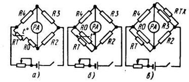 Термометры сопротивления включают в измерительную цепь, составленную из резисторов по схеме четырехплечего моста. Низкоомный термометр сопротивления RT (рисунок 53, а) включают последовательно, а высокоомный (рисунок 53, б) - параллельно какому-либо плечу моста.