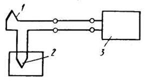 Температуры выше 300-350° С измеряют с помощью термопары. При нагреве спая двух проводников, выполненных из разнородных металлов, в них возникают термо-ЭДС, которая вызывает электрический ток при замыкании проводников. Сила тока, пропорциональная разности температур (t1 - t2) горячего 1 и холодного 2 спаев (рисунок 54), измеряется прибором 3. Для испытаний агрегатов автомобилей рекомендуется применять хромель-копелевую термопару, имеющую высокую термо-ЭДС и верхний температурный предел 600-800° С.