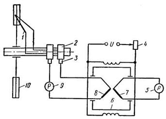 При обработке осциллограммы 1 оператор с помощью рукоятки 2 перемещает двуплечий рычаг 3 так, чтобы стрелка-указатель следовала за кривой. При этом скользящий контакт 7 перемещается по контактным пластинам 8 коммутаторного устройства и одновременно замыкает контакты 5-4 или 5-6 переключателя в зависимости от направления движения стрелки-указателя.