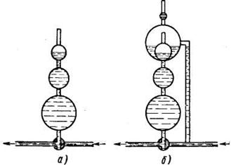 Объемные методы более многообразны и находят применение как в стендовых, так и в дорожных испытаниях. Наиболее просто можно измерить расход открытым мерным цилиндром или другой емкостью, например, сферической формы (рис. 29, а). В дорожных условиях на участке замера двигатель работает на топливе, поступающем из мерной емкости. Израсходованный объем топлива определяют по шкале мерного цилиндра или по числу сферических емкостей.