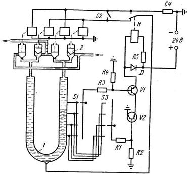 1 - измерительная U-образная трубка; S1 - переключатель для изменения мерной дозы; 2 - клапанный механизм; S2 - тумблер для отключения мерных устройств; К - реле; СЧ - счетчик импульсов, R1 - R5 - резисторы; VI и V2 - транзисторы; D - диод