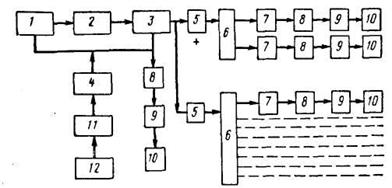 Сигналы от тензорезисторов 1, наклеенных на исследуемую деталь, через выпрямитель 2 поступают к модулятору 3, который преобразует изменяющееся напряжение в прямоугольные импульсы. Через полупроводниковые диоды 5, сортирующие импульсы по знаку, и усилители 6 сигнал поступает к амплитудным анализаторам 7, пересчетным схемам 8, которые снижают частоту импульсов от 500 до 4 Гц, к двухкаскадным усилителям постоянного тока 9 и к импульсным счетчикам 10. Нулевой счетчик подсчитывает суммарное число импульсов за время работы прибора. Питание прибора осуществляется от аккумулятора 12 через преобразоваи фильтр 4.