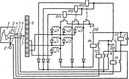 С переменой направления движения при достижении минимума замыкаются контакты 5-6 и включается реле Р2, которое подает на контакт 7 напряжение 12 В. Это напряжение через пластину 8, на которой в данный момент находится контакт 7, включает одно из поляризованных реле ПР1-ПРЗ; через замкнутые контакты реле РЗ. При этом фиксируется значение минимума на кривой. Реле Р4, получая питание от контактов реле ПР1-ПРЗ, включает реле Р2 и обесточивает контакт 7.