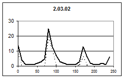 Рис. 3. Динамика звуколокализационной функции: полное доминирование правого (стандартная учебная нагрузка - А) и левого (ситуация экзамена - Б) полушарий у одного из испытуемых. По оси Х – показатели звуколокализационной функции, по оси У – интерауральная задержка (мкс).