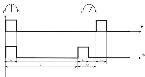 Рис. 2. Временная диаграмма серии дихотических стимулов, t1 – продолжительность звукового импульса; Dt – интерауральная временная задержка; T – период в серии.