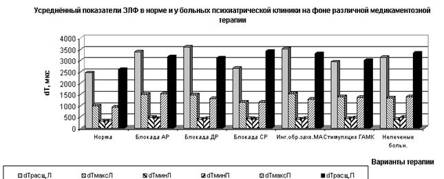 Более сложным является действие психотропных препаратов на звуколокализационную функцию. Прежде всего, обнаружено, что отсутствие значимых отличий от контроля более выраженно проявляется в показателях, характеризующих доминирование правого полушария (dTмин. Л, dTмакс. Л и dTрасщ. П), - 22,5% случаев, тогда как относительная нормализация показателей активности левого полушария (dTмин. П, dTмакс. П и dTрасщ. Л) наблюдалась только в 15% случаев. Особенно заметно это проявляется в отношении функции расщепления, где нормализация dTрасщ. П встречается почти вдвое чаще, чем нормализация dTрасщ. Л (65% против 35%, соответственно). Характерно, что именно показатель устойчивости звукового образа при движении звука вправо оказался единственным, статистически значимо совпадающим с нормой (p>0,95), - в группе больных, не получавших холинолитики. С другой стороны, наиболее выраженные отклонения показателей ЗЛФ от нормы, в основном, отмечались в группе параметров, отражающих доминирование левого полушария (dTмин. П, dTмакс. П и dTрасщ. Л) – 11,7% против 6,7% для правого полушария.
