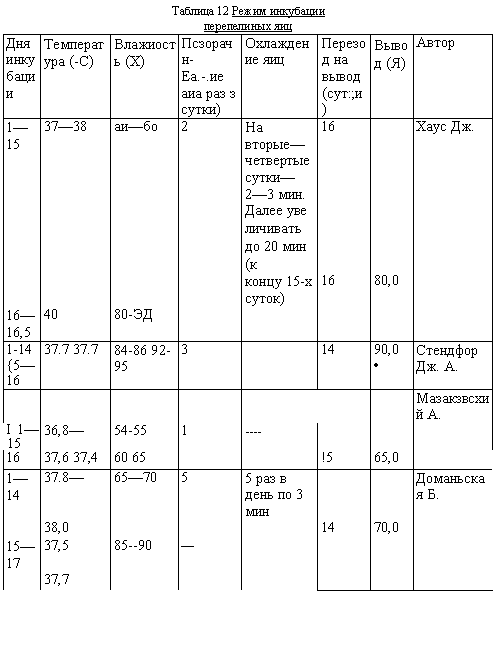 Режимы инкубации перепелиных яиц, рекомендуемые различными исследователями, несколько отличаются, что, вероятно, зависит от климатических условий, времени годя, конструкции инкубатора и от других факторов (табл. 12).