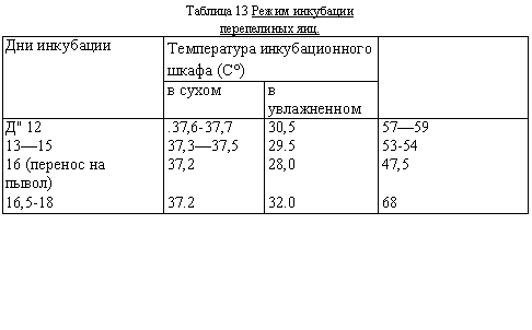 На основе многих исследований автором разработан режим инкубации перепелиных яиц. который применяется в цехе инкубации производственно - экспериментальной птицефабрики Научно-производственного объединения (НПО) клеежелатиновой и птицеперерабатывающей промышленности «Комплекс» и в других перепеловодческих хозяйствах нашей страны (табл. 13).