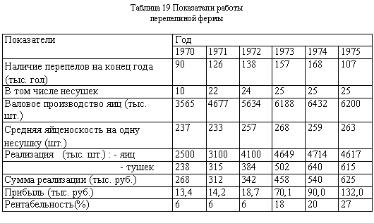 Механизация процессов снятия оперения с тушек перепелов позволила резко увеличить производство перепелиного мяса и снизить его себестоимость, в настоящее время себестоимость 10 перепелиных яиц в совхозе составляет 19 коп, а одной тушки — 53 коп. Экономическая эффективность перепеловодческой фермы в совхозе «Приморский» приведена в таблице 19.