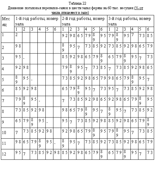 В примере, приведенном в таблице 21, яйценоскость на срединою самку составляет 250 штук в год, а валовое производство яиц — 2217 тыс. Среднее поголовье самок равно 8870 головам, или 80,6% от начального. На основе данных, приведенных в таблицах 20 и 21, разработан технологический процесс для фермы мощностью 60 тыс. перепелов.
