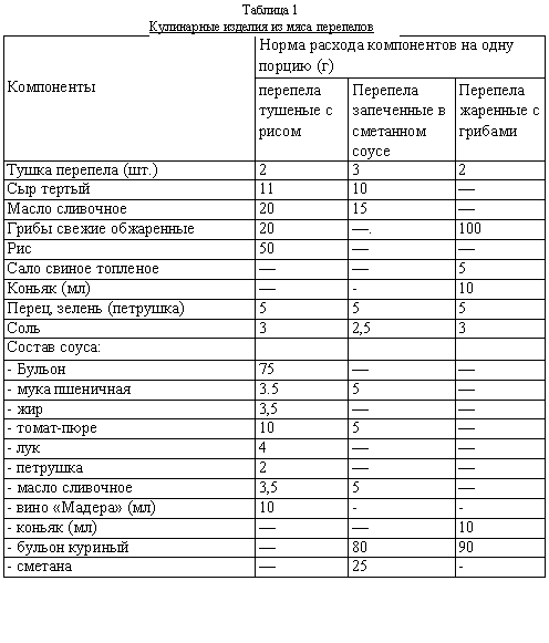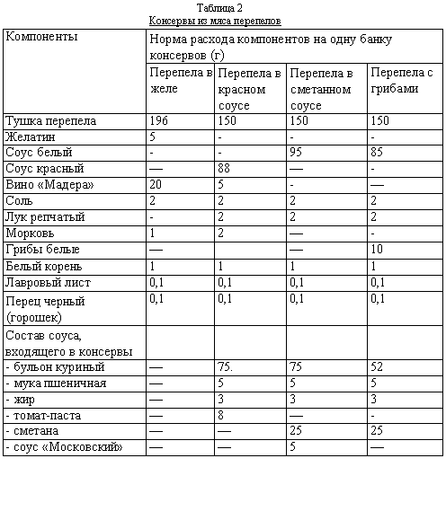 Лучший способ тепловой обработки молодых перепелов — запекание. При этом мясо получается более сочным, нежным и вкусным. Старых перепелов лучше тушить в кастрюлях с плотно закрывающейся крышкой. Тушение производят при температуре ° С. Мясо покрывается корочкой, как т при сухом способе обработки. Предлагаются следующие кулинарные изделия и консервы из мяса перепелов (табл.