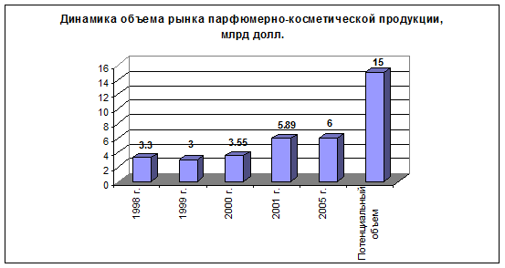 По данным исследований, при любом уровне жизни человек тратит на средства по уходу за собой не менее 4% дохода, так что стоимостной объем рынка парфюмерно-косметической продукции довольно велик. По оценкам специалистов Российской парфюмерно-косметической ассоциации, объем российского парфюмерно-косметического рынка на начало 2000 г. составил 3 млрд долл., на начало 2001 г. - 3,55 млрд долл., а, по данным специалистов ОАО "Концерн "Калина", к началу 2002 г. он достиг 5,89 млрд долл. Ожидается, что к 2005 г. емкость рынка составит более 6 млрд долл.