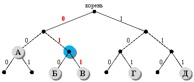 1) построим двоичное дерево, в котором от каждого узла отходит две ветки, соответствующие выбору следующей цифры кода – 0 или 1; разместим на этом дереве буквы А, Б, В, Г и Д так, чтобы их код получался как последовательность чисел на рёбрах, составляющих путь от корня до данной буквы (красным цветом выделен код буквы В – 011):