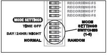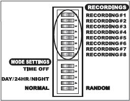 4). Произвести установку переключателей голосов (Recordings # 1 - # 8), переключателей режимов (TIME-OFF; DAY/24HR/NIGHT; RANDOM) в нужное Вам положение. (Смотрите ниже раздел “Программирование прибора”).
