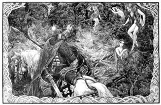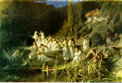 Над образом русалки работал (эскиз 1880-хгг.). Близка народно-поэтическому «Русалка» И. Билибина (1934), сопровождаемая собственноручной подписью художника: «Русалка парней завлекает и топит».