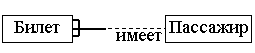 Каждый экземпляр сущности должен быть отличим от любого другого экземпляра той же сущности (это требование в некотором роде аналогично требованию отсутствия кортежей-дубликатов в реляционных таблицах). Связь – это графически изображаемая ассоциация, устанавливаемая между двумя сущностями. Эта ассоциация всегда является бинарной и может существовать между двумя разными сущностями или между сущностью и ей же самой (рекурсивная связь). В любой связи выделяются два конца (в соответствии с существующей парой связываемых сущностей), на каждом из которых указывается имя конца связи, степень конца связи (сколько экземпляров данной сущности связывается), обязательность связи (т. е. любой ли экземпляр данной сущности должен участвовать в данной связи). Связь представляется в виде линии, связывающей две сущности или ведущей от сущности к ней же самой. При этом в месте "стыковки" связи с сущностью используются трех точечный вход в прямоугольник сущности, если для этой сущности в связи могут использоваться много (many) экземпляров сущности, и одноточечный вход, если в связи может участвовать только один экземпляр сущности. Обязательный конец связи изображается сплошной линией, а необязательный – прерывистой линией. Как и сущность, связь – это типовое понятие, все экземпляры обеих пар связываемых сущностей подчиняются правилам связывания. В изображенном ниже примере связь между сущностями БИЛЕТ и ПАССАЖИР связывает билеты и пассажиров. При том конец сущности с именем «для» позволяет связывать с одним пассажиром более одного билета, причем каждый билет должен быть связан с каким-либо пассажиром. Конец сущности с именем «имеет» означает, что каждый билет может принадлежать только одному пассажиру, причем пассажир не обязан иметь хотя бы один билет.