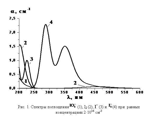 Как показали проведенные нами предварительные экспериментальные исследования, чувствительность разработанного в [3, 4] способа может быть повышена при проведении измерений в более коротковолновом спектральном диапазоне, поскольку в области 200-400 нм йодсодержащие вещества имеют ряд линий поглощения, для которых величины сечений поглощения в несколько раз превышают величины сечений поглощения в видимой области спектра.