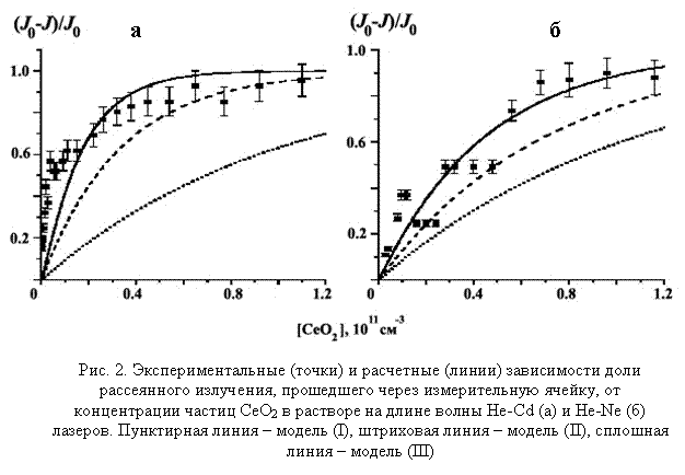 Выбор наиболее подходящей теоретической модели светорассеяния определялся с помощью экспериментальных исследований. В качестве исследуемых веществ были выбраны оксиды бария, церия и стронция, характерные для жидких сред, образующихся при переработке ОЯТ. В качестве источников излучения использовались He-Ne (633 нм) и He-Cd (441 нм) лазеры.