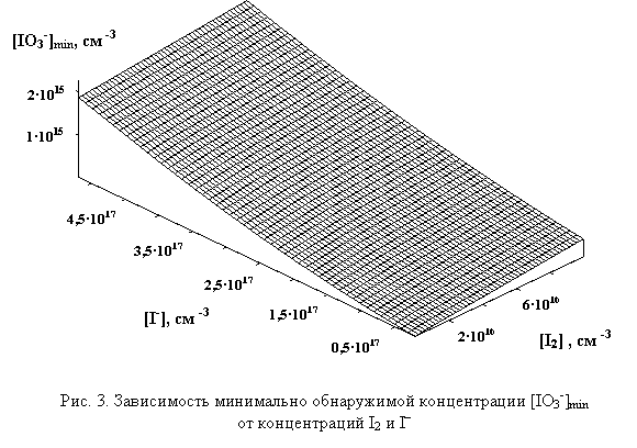 На рис. 3 приведена зависимость минимально обнаружимой концентрации [IO3-]min от концентраций молекулярного йода и аниона I–. Видно, что чувствительность детектирования IO3- способом, разработанным для кислых и щелочных жидких сред (1,2×1014 см-3), не всегда может быть реализована на практике.