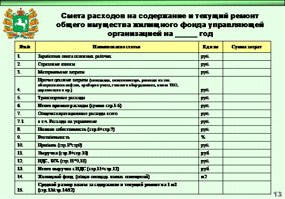Для учета своих затрат в целом по всему жилищному фонду управляющая компания формирует общую смету расходов и выводит средний размер платы за содержание и ремонт общего имущества управляемого жилищного фонда.