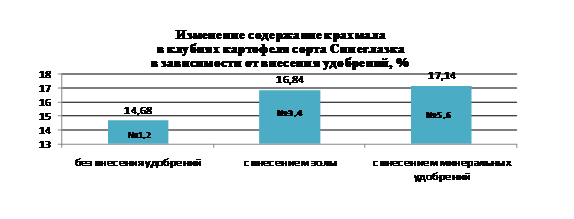 Вывод: при выращивании картофеля сорта Синеглазка при различных условиях получен результат, подтверждающий гипотезу. Чем выше плодородие почвы, тем выше содержание крахмала. В нашем случае, наибольшее содержание крахмала наблюдалось при одноразовом внесении минеральных удобрений перед посадкой (участки №5,6).
