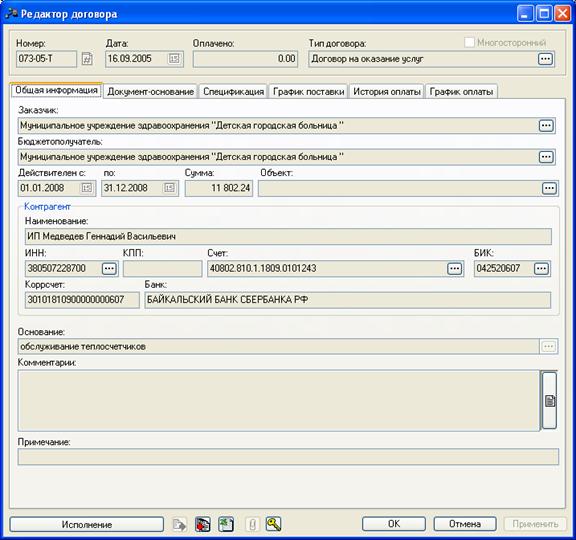 Рис.4. Редактор договора. Закладка «Общая информация»