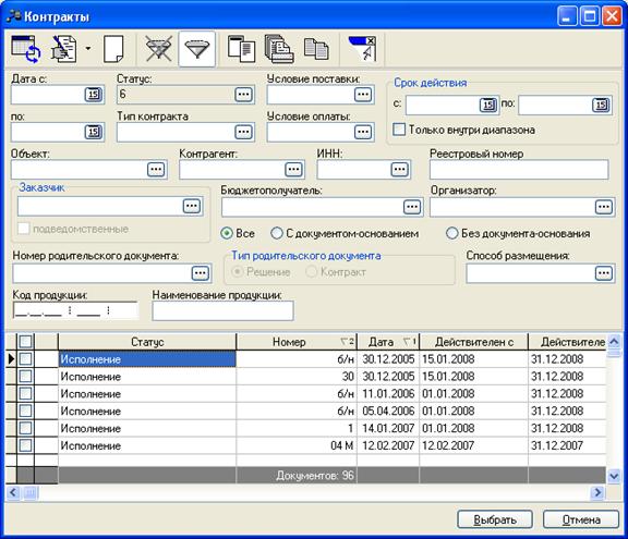 Для выбора документа, на основании которого должен быть сформирован ЭД «Договор», нажимается кнопка Выбрать. На экране появится список ЭД «Контракт», которые находятся в статусе «исполнение», см рис.7.