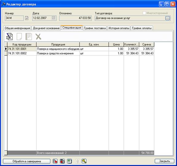 Рис.8. Редактор договора. Закладка «Спецификация»