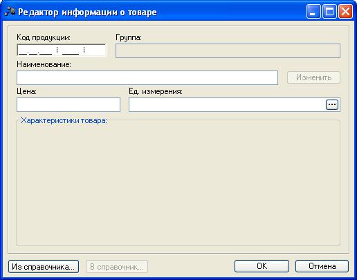 - Код продукции – код закупаемой продукции. Группа – название группы, к которой относится закупаемая продукция. Наименование – название продукции. Цена – цена единицы продукции. Ед. измерения – единица измерения продукции. Характеристики товара – список индивидуальных свойств группы товаров.