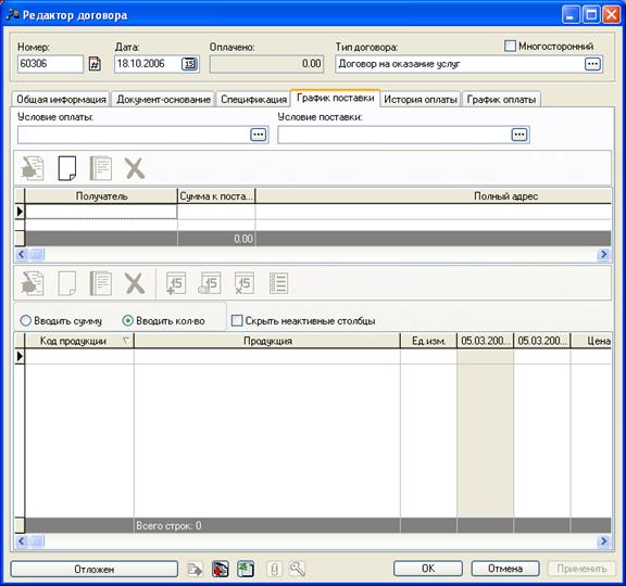 В колонке с указанием даты или периода поставки вводится сумма оплаты на поставку или количество поставляемой продукции. При вводе значений автоматически рассчитываются значения в колонках Количество и Сумма.