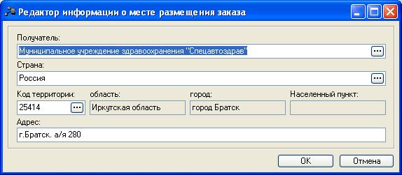 добавляется новое место поставки. На экране появится Редактор информации о месте размещения заказа (рис.11).