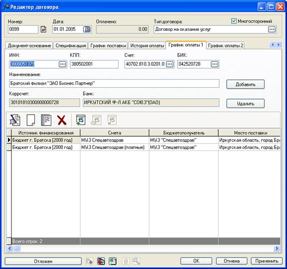 После ввода необходимой информации об организации контрагенте заполняется список бюджетных строк, по которым осуществляется оплата.