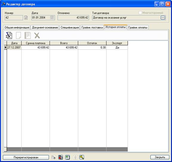 На закладке находится список информации об истории оплаты по договору. Над списком находится панель инструментов, на которой располагаются стандартные функциональные кнопки. С их помощью можно добавить новую информацию об истории оплаты