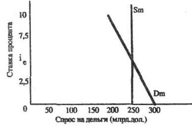 Общий спрос на деньги, Dm, определяется путем смещения по горизонтальной оси кривой спроса на деньги со стороны активов Da, на величину, равную спросу на деньги для сделок Dt. Соединение денежного предложения Sm с общим спросом на деньги Dm. дает картину денежного рынка и определяет равновесную ставку процента, Iе.