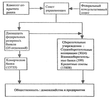 Со времени принятия Закона о дерегулировании депозитных учреждений и монетарном контроле в 1980 г. сберегательные учреждения также подчиняются тем решениям Совета управляющих, которые имеют целью изменение денежного предложения. В задачи банков и сберегательных учреждений входит прием денежных вкладов и выдача ссуд.