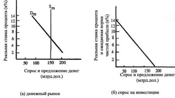 Уменьшение предложения денег с Sm до Sm1 создает временную нехватку денег на денежном рынке. Люди и учреждения пытаются получить больше денег путем продажи облигаций. Поэтому предложение облигаций увеличивается, что понижает цену на облигации и поднимает процентную ставку. При более высокой процентной ставке количество денег, которое люди хотят иметь на руках, уменьшается. Следовательно, количество предложенных и требуемых денег снова равно при более высокой процентной ставке. Увеличение предложения денег с Sm до Sm2 создает временный избыток денег, в результате чего увеличивается спрос на облигации и цены на них становится выше. Процентная ставка падает, и на денежном рынке восстанавливается равновесие.