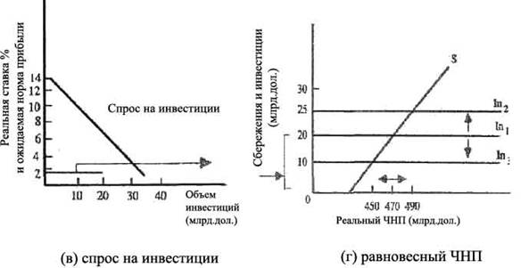 Если ЧНП, характеризующийся полной занятостью, равен 490 млрд. дол., то расширение денежного предложения со 150 до 175 млрд. дол., понизит процентную ставку с 8 до 6, как отмечено на рис. (а), и увеличит объем инвестиций с 20 до 25 млрд. дол„ как показано на рис. (б). Сдвиг вверх графика инвестиций на рис. (в) от In1 к In2 на величину 5 млрд. дол. при мультипликаторе равном 4, повысит равновесный ЧНП с 470 млрд. дол. до желаемого 490- миллиардного уровня.