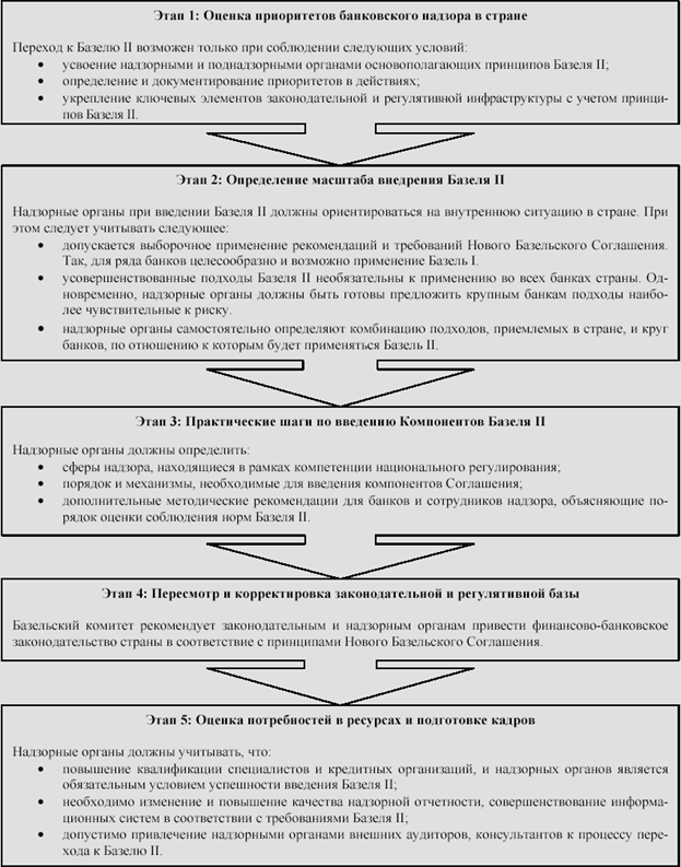 Новое Соглашение о капитале – это очень крупный проект, успешность реализации которого требует особой подготовки как регулирующих, так и регулируемых органов. Во избежание возможных негативных последствий, с которыми может столкнуться банковская система, весь объем подготовительной работы должен быть разбит на этапы. Базельский комитет в своих рекомендациях определил порядок введения Соглашения[3], соблюдение которого позволит обеспечить эффективность и безболезненность перехода национальной банковской системы к новым требованиям по капиталу и надзору. (См. Приложение 3)